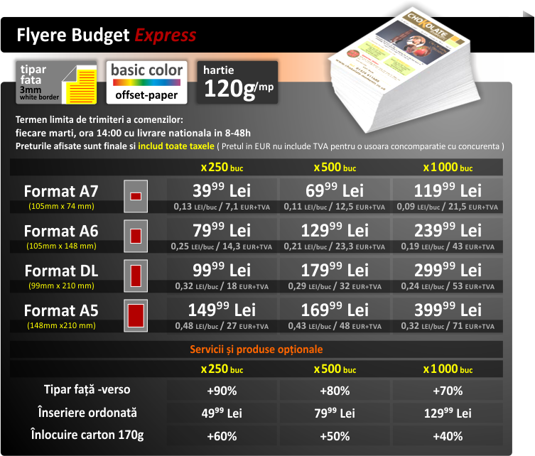 Dacă timpul nu vă permite să vă încadrați în ciclul de producție propus de noi, vă oferim diverse alternative express, fie în varianta Budget, care oferă o soluție de comunicare plăcută, accesibilă în tiraje mici și rapide sau varianta Premium Express, dedicată celor mai exigenți consumatori.