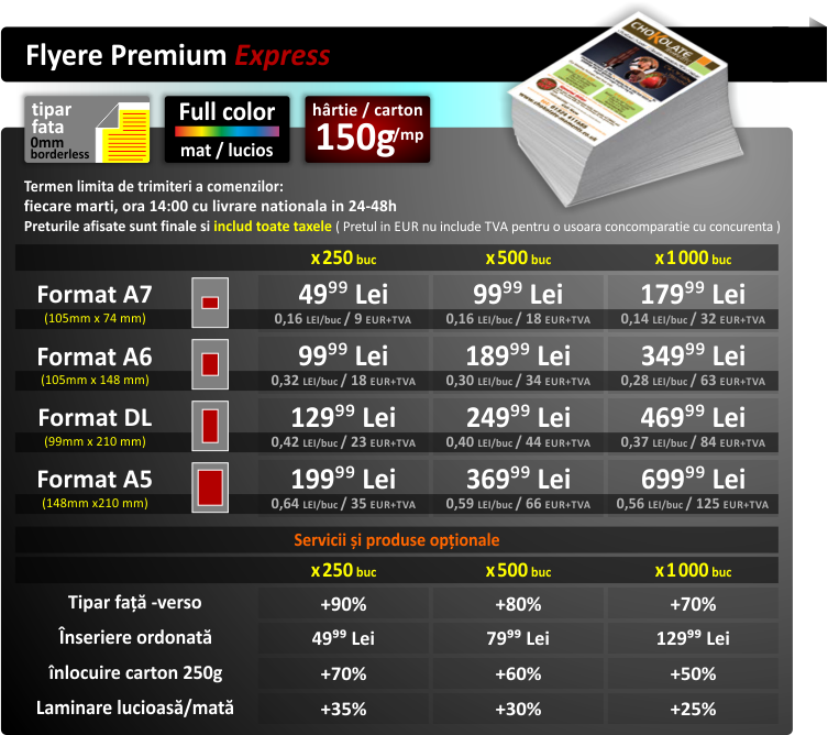 Produsul recomandat pentru cele mai des întâlnite situații este varianta noastră de Pliante și Flyere Premium, imprimate pe o hârtie de 150g, de o calitate semnificativ mai bună decât orice alt produs obișnuit (flyerele primite prin poștă sau în zone aglomerate tind să fie triate după calitate înainte de conținut). Cantitățile au fost și ele optimizate pentru ceea ce experiența ne-a arătat că este ideal.